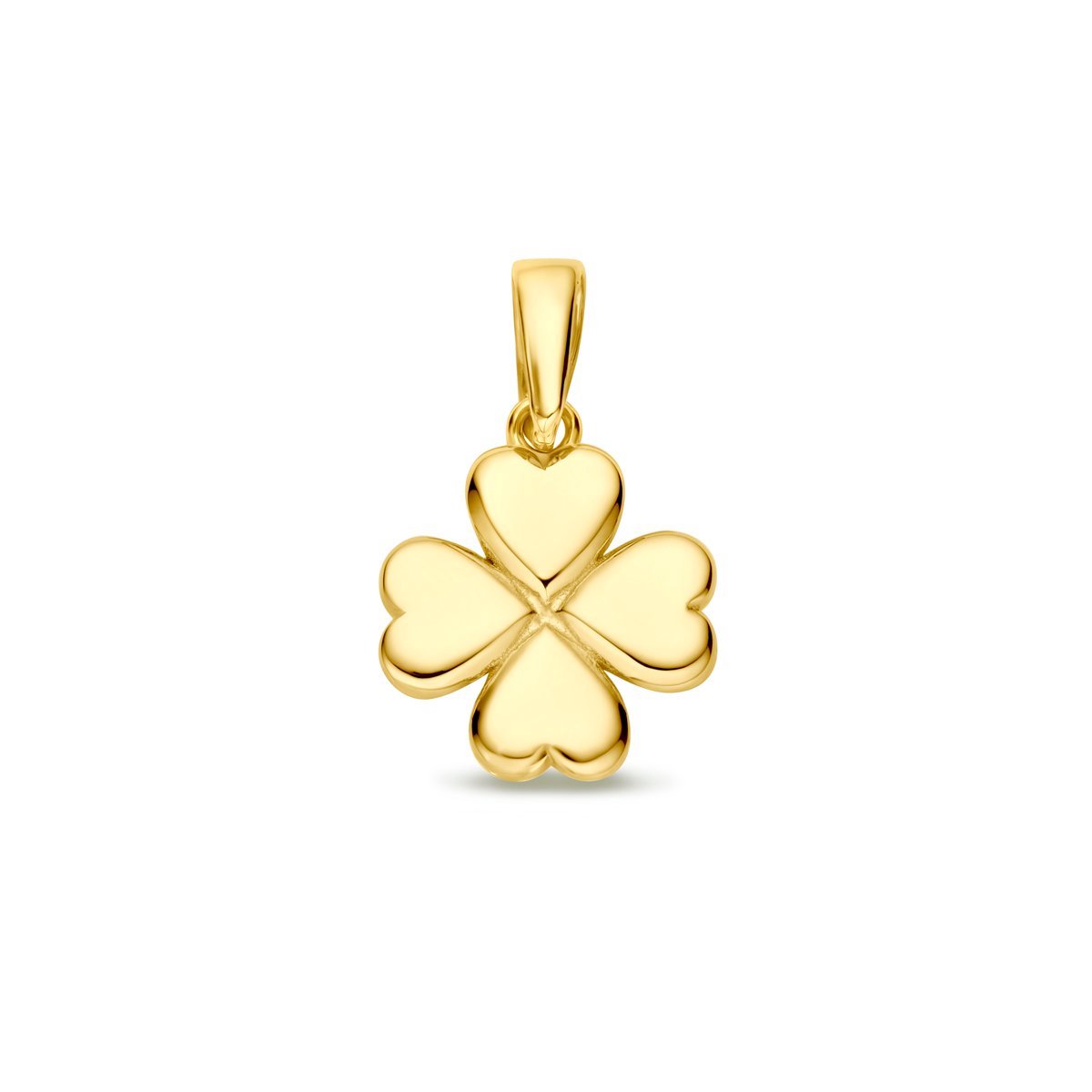 14k Geelgouden hanger uitgevoerd met een klavertje. De hanger heeft een totale hoogte van 16mm.