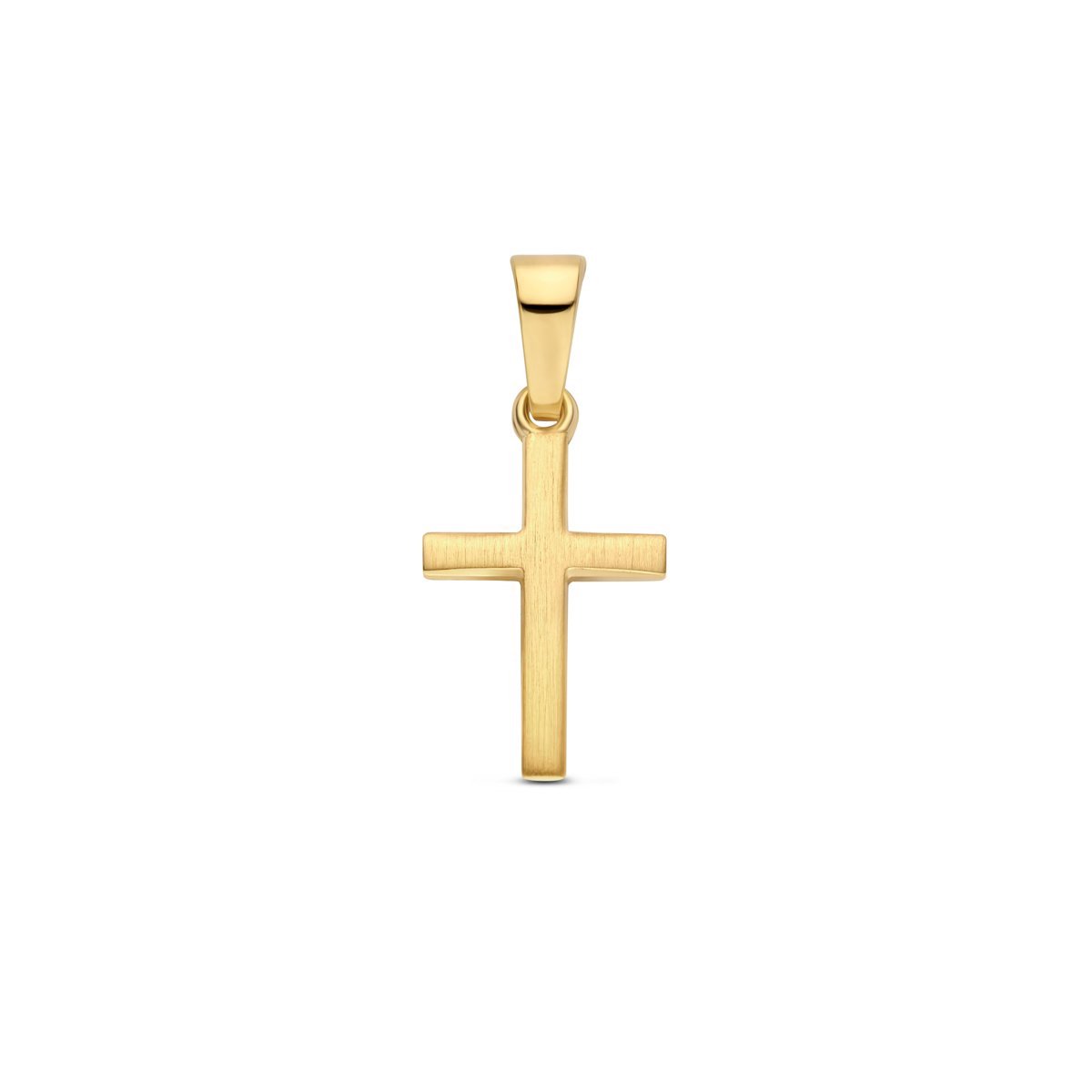 14k Geelgouden hanger in de vorm van een kruis. De christelijke hanger (https://www.its-beautiful.nl/sieraden/christelijk/) heeft een totale hoogte van 20mm en een afmeting van 13x9mm.
