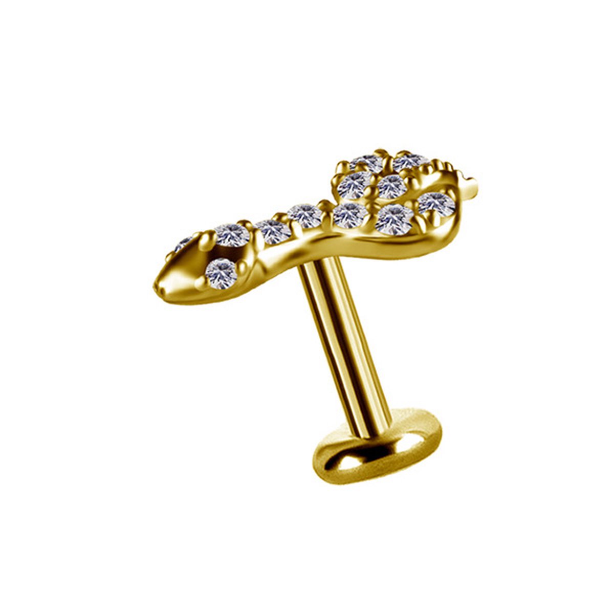 Sier je oor met deze prachtige internaal geschroefde oorpiercing van 18 karaats goud, voorzien van een betoverend slangenontwerp en schitterende zirkonia stenen. Dit unieke stuk combineert de elegantie van goud met de aantrekkingskracht van een slang, wat resulteert in een fascinerende uitstraling. De gedetailleerde elementen van het slangenontwerp en de sprankelende zirkonia stenen voegen een vleugje verfijning en glamour toe. Met zijn uitzonderlijke vakmanschap en luxueuze materialen is deze internaal geschroefde oorpiercing een ware blijk van jouw verfijnde smaak.