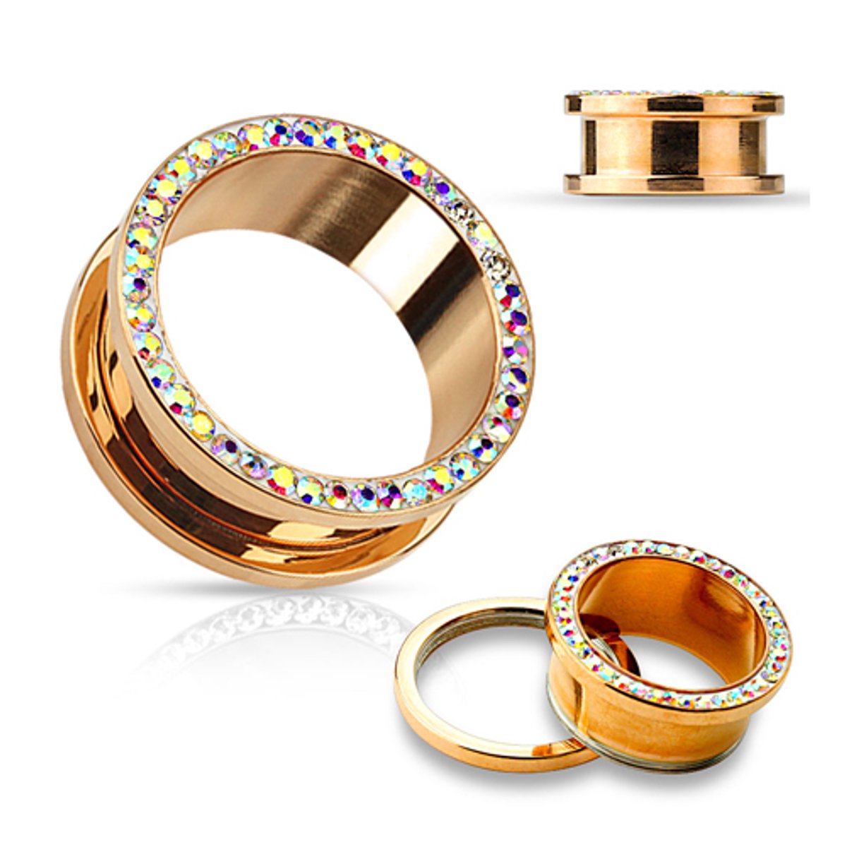 tunnel van rose kleur gold plated. in de rand zitten multi kleurige steentjes verwerkt voor een geweldige glim. door deze tunnel kun je door de tunnel en dus door het oor heen kijken!