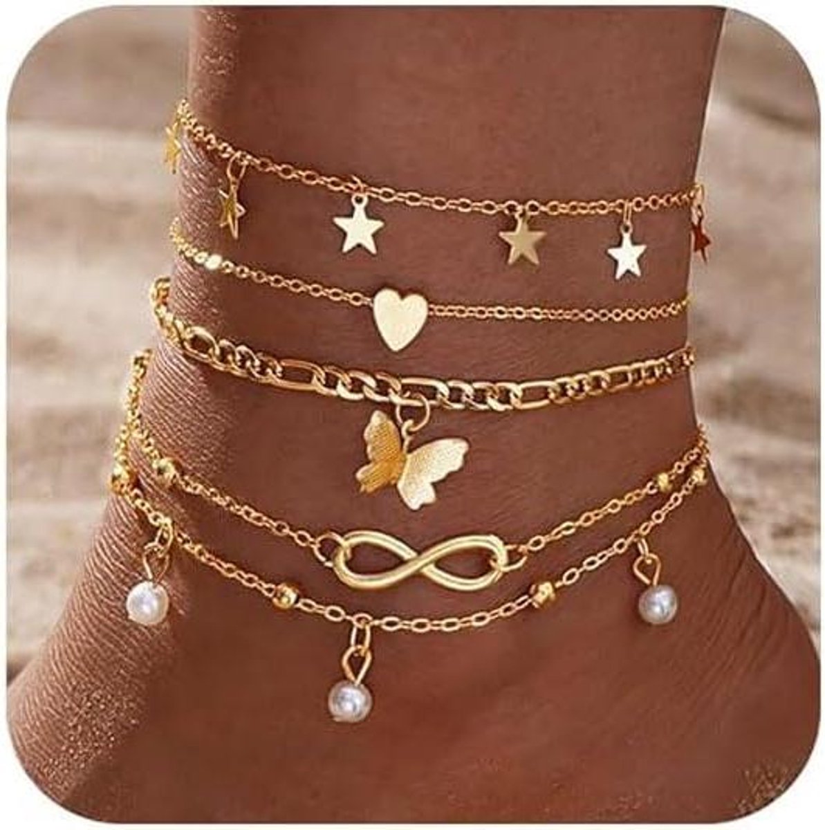 Met deze unieke vijfdelige set voeg je een maritieme charme en elegantie toe aan je outfit. De set bevat vijf verschillende enkelbanden, elk met een speciaal symbool zoals een pentagram, een hart en een vlinder. Een perfecte manier om je accessoirecollectie te personaliseren.
