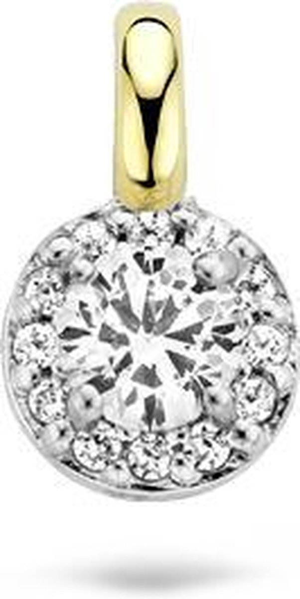 De zetting van deze rozethanger is uitgevoerd in 14 karaats witgoud. Het hangeroog is gemaakt van geel goud, zodat het hangertje te combineren is met geelgouden kettingen. De diameter van de hanger is 5,5 millimeter en de zirkonia’s briljant geslepen.