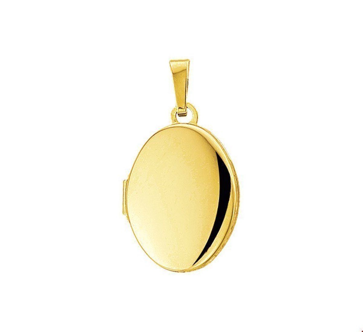 Geelgouden medaillon met een poli afwerking. In het medaillon passen twee fotos.