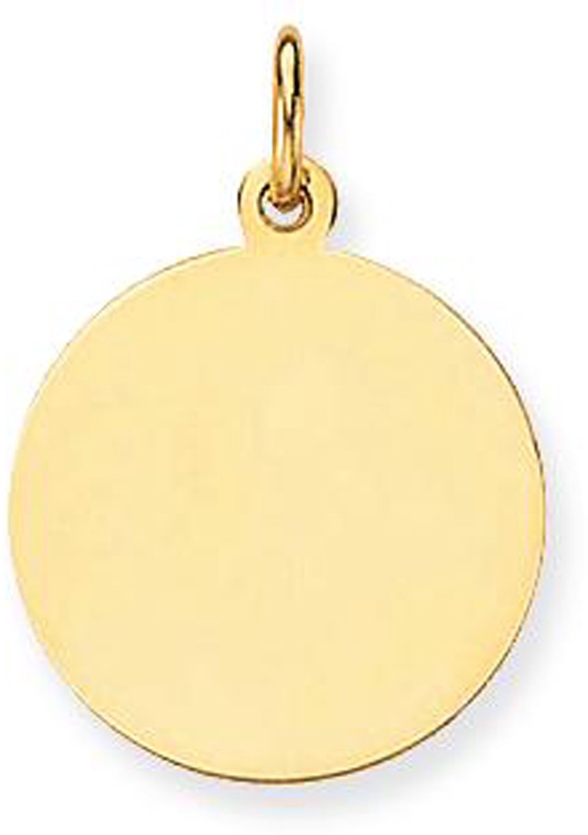 Prachtig geelgouden graveerplaatje in de vorm van een rondje. Dit luxe hangertje met glanzende afwerking en een doorsnede van 16 mm kan door dames, heren en kin deren aan een collier of een armband gedragen worden.