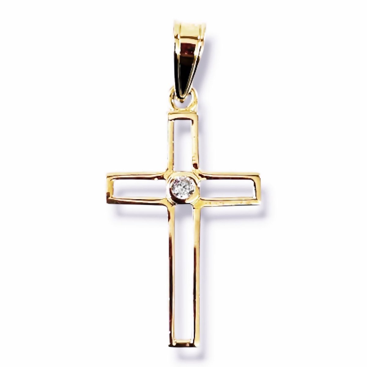 De hanger heeft een verfijnd, opengewerkt ontwerp, waarbij de strakke lijnen van het kruis zijn vervaardigd uit hoogglans gepolijst geelgoud. In het hart van het kruis is een schitterende, briljant geslepen zirkonia gevat, die het licht bij elke beweging prachtig vangt en als stralend middelpunt fungeert. De combinatie van het luchtige ontwerp en de fonkelende steen geeft deze hanger een lichte en elegante uitstraling.
