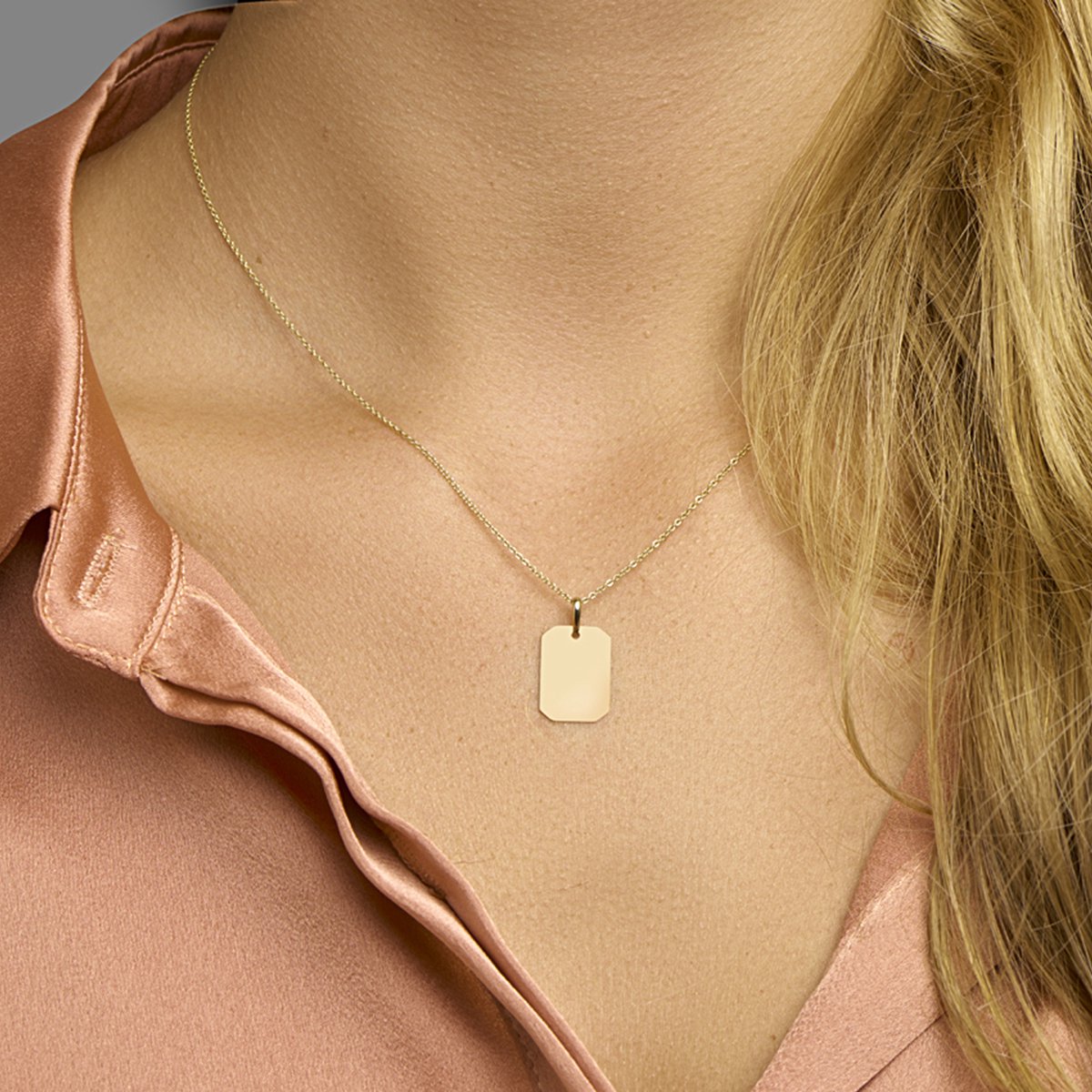 14k Geelgouden graveerhanger met een afmeting van 16x11mm. De hanger heeft een totale hoogte van 20mm en een dikte van 0.5mm.