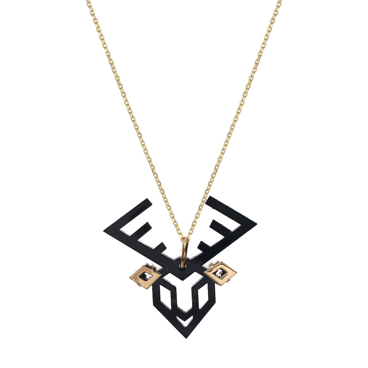‘Ciervo Hanger’| 14 Karaat Goud Verguld Messing| Zwart Celluloseacetaat | Lengte: 4cm | Breedte: 4.5 cm | 100% Nikkelvrij | Handgemaakt in Madrid door ervaren goudsmeden | Ketting niet inbegrepen.