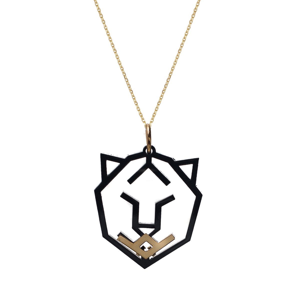 ‘Leon Hanger’| 14 Karaat Goud Verguld Messing| Zwart Celluloseacetaat | Lengte: 4.5cm | Breedte: 4 cm | 100% Nikkelvrij | Handgemaakt in Madrid door ervaren goudsmeden | Ketting niet inbegrepen. De ‘Animalis’ collectie: Uit deze collectie doneert Hôbe 10% van de verkoopopbrengst aan organisaties die dieren ondersteunen.