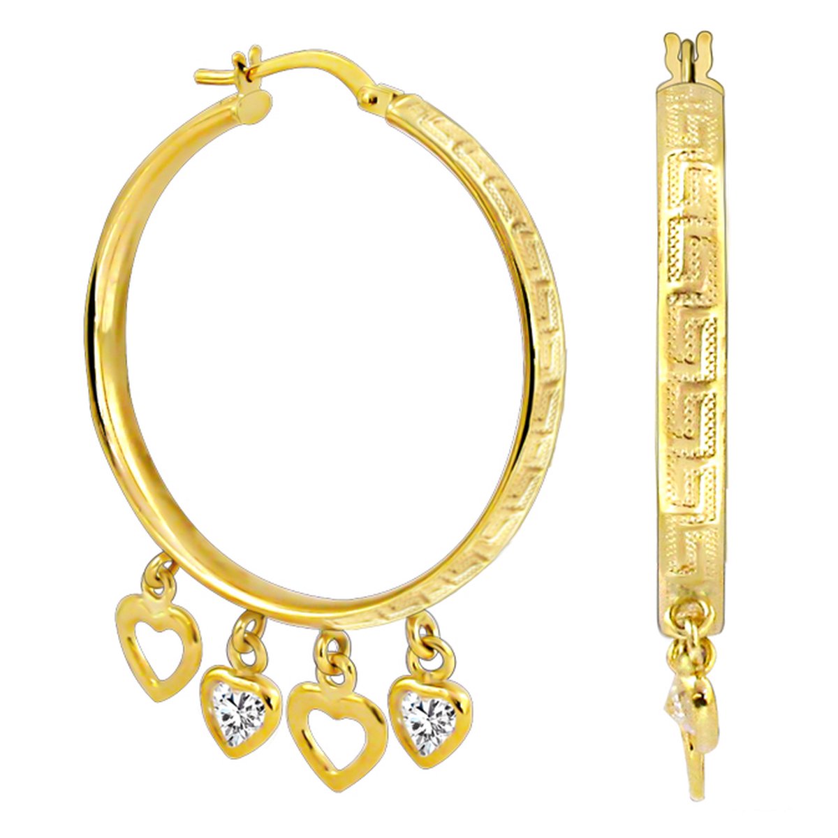 Prachtige 14 karaats geelgouden oorbellen met bedels (hartjes). De stenen zijn gezet en zijn van zirkonia. De oorbellen zelf zijn aan de buitenzijde voorzien van het meander teken. Dit model is verkrijgbaar in verschillende maten.