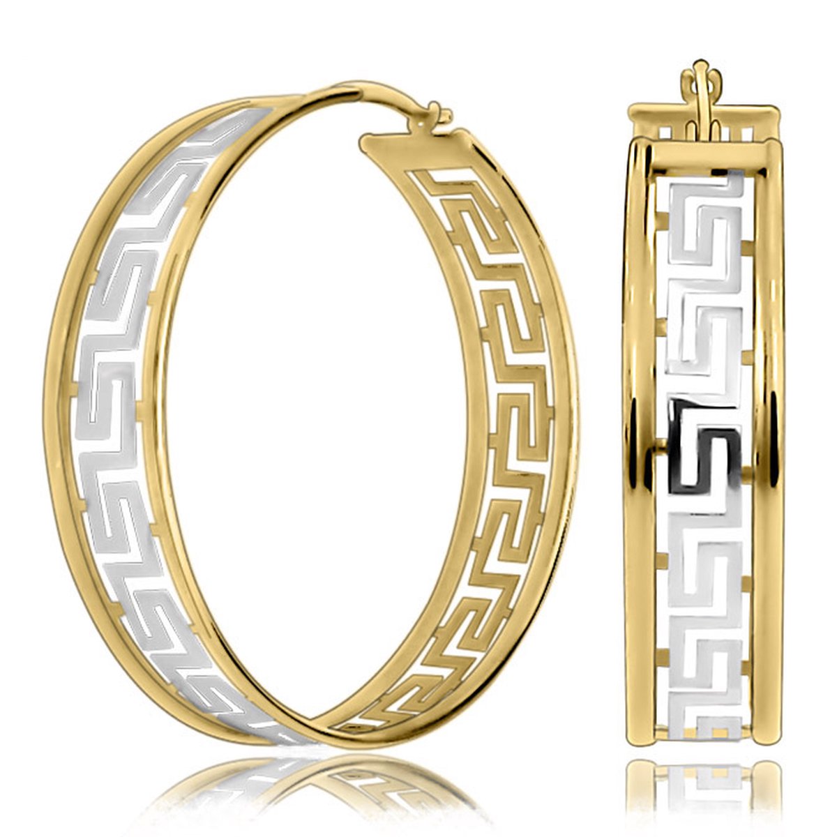 Prachtige 14 karaat bicolor gouden oorbellen voorzien van meander teken. Deze prachtige oorbellen zijn gemaakt van witgoud en geelgoud.