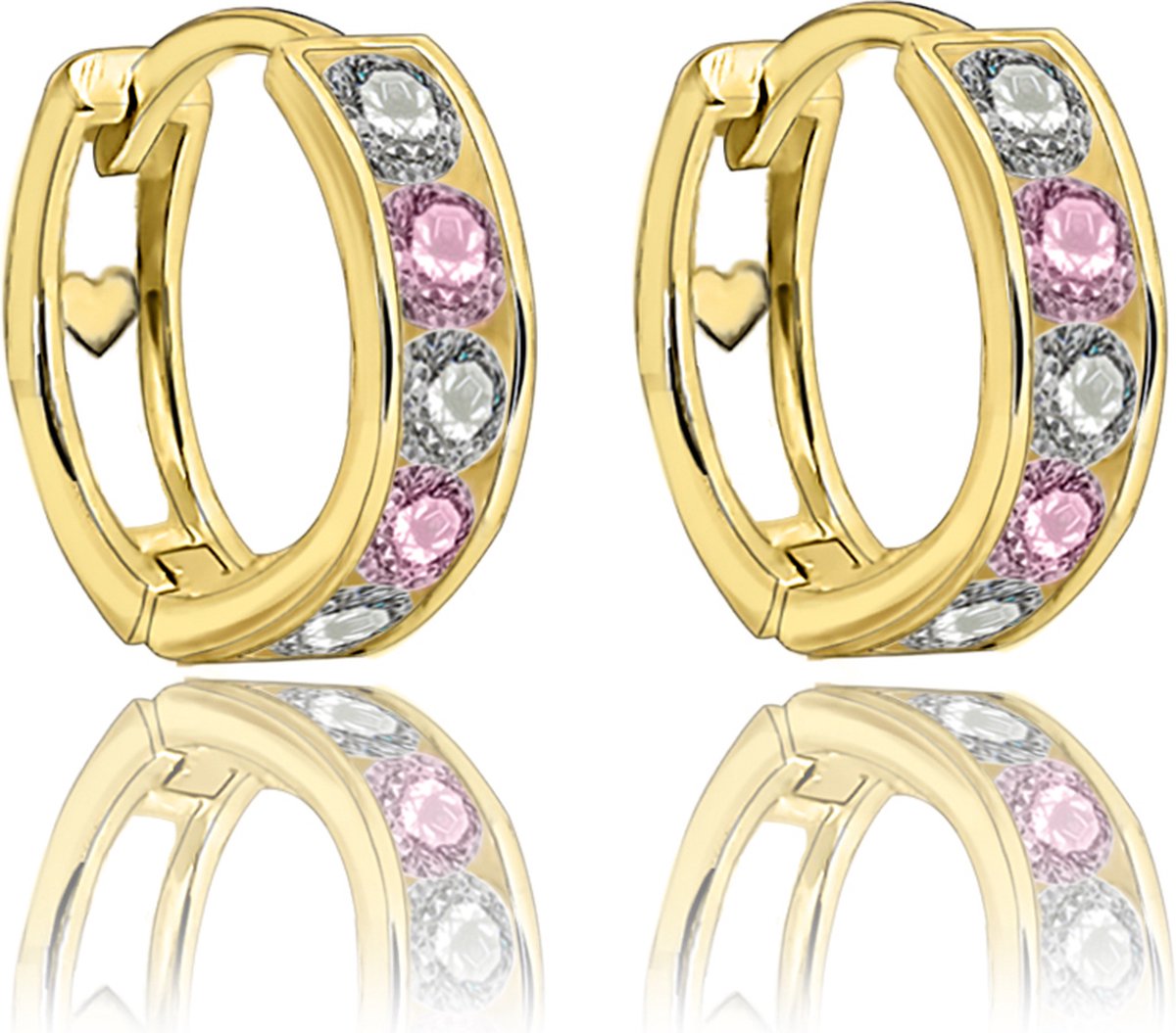 Gouden kinderoorbellen met roze zirkonia stenen. De oorbellen bestaan uit 14 karaat geelgoud en hebben een diameter van 10 mm.