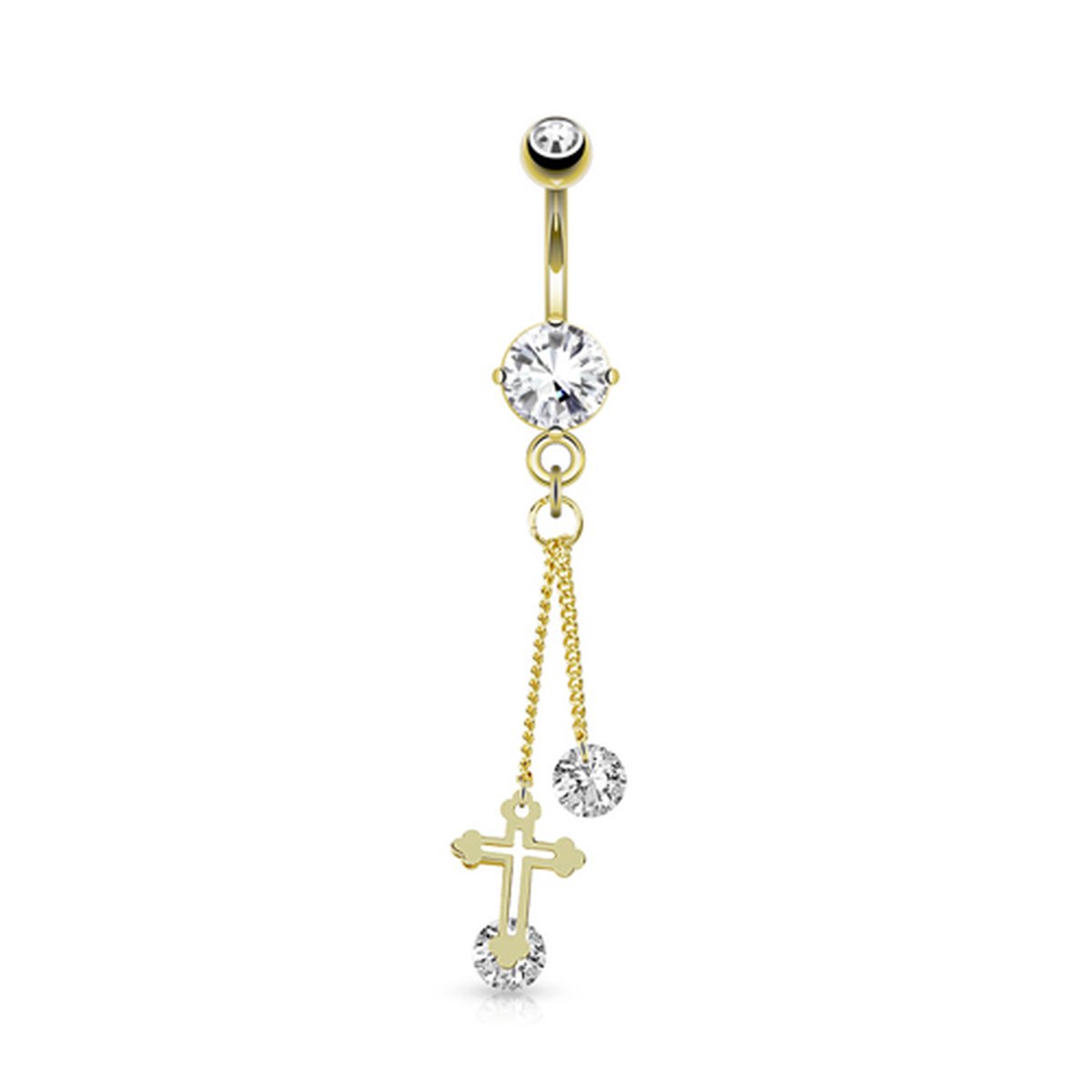 Navelpiercing kruis met lange hanger CZ steen wit gold plated 14kt. – LMPiercings