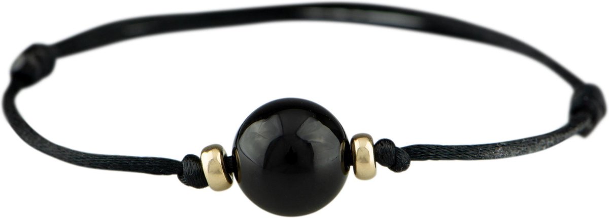 Simplistische satijnkoord armband met een Onyx steen en 14kt gouden beads. In lengte verstelbaar.