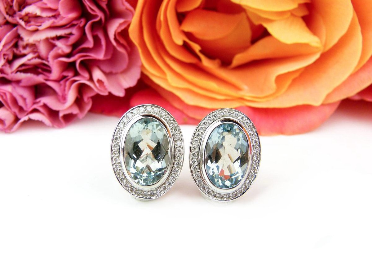 oorringen in wit goud gezet met aquamarijn en diamant diamant = 0.60 cts