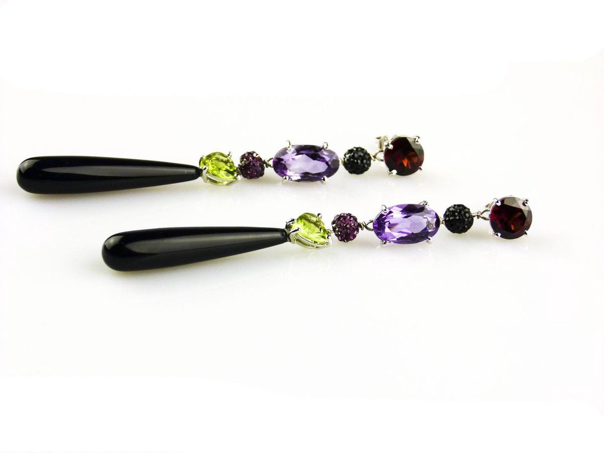 oorringen in wit goud gezet met granaat, peridoot, amethist, en onyx druppel