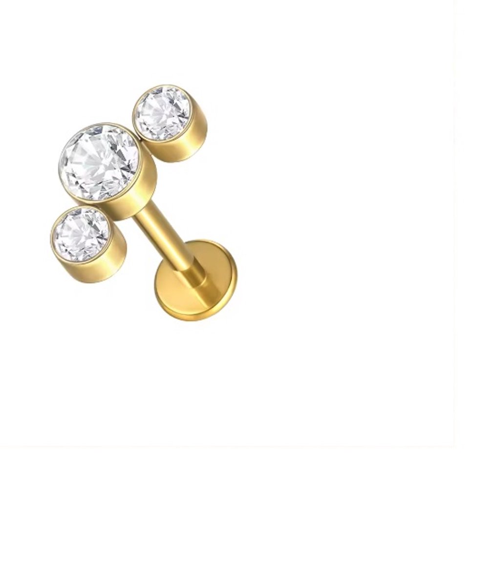 Goudkleurige Labret Piercing met 3 Zirkonia – Titanium – 12 x 6 mm – Geschikt voor Tragus, Helix, Conch & Kraakbeen – Luxe Oorpiercing van Hoge Kwaliteit