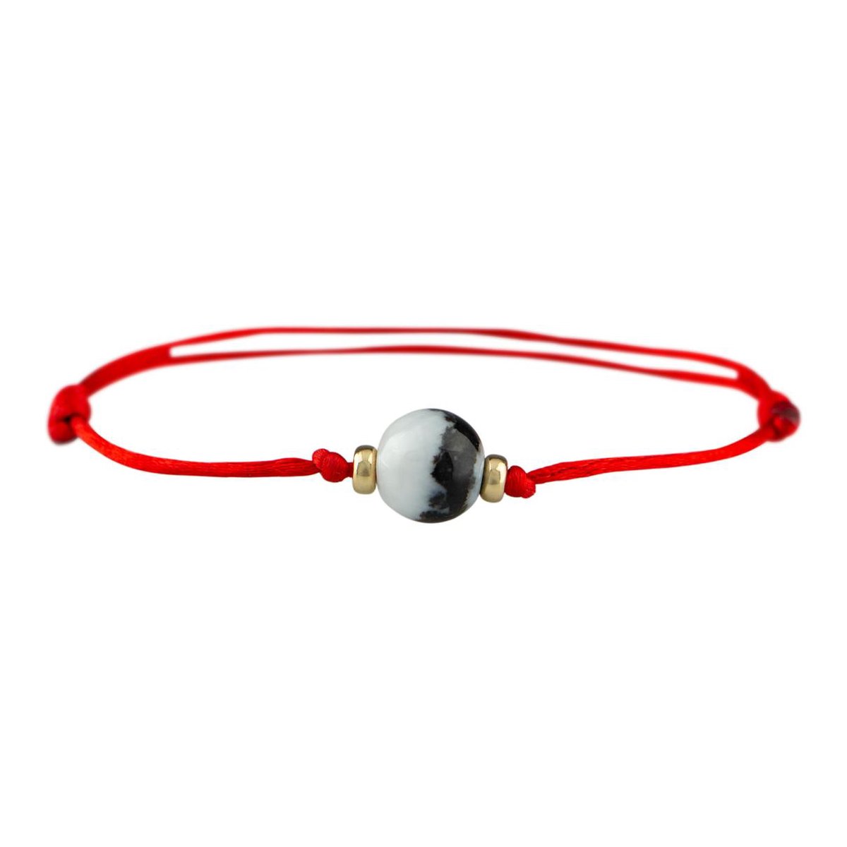 Simplistische satijnkoord (rood) armband met een Zebra Jasper steen en 14kt gouden beads. In lengte verstelbaar.